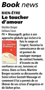--> Interview de Martine Berger 8h40 : Livre : Le toucher d'amour du 15 juin 2015 Le stress, l'un des maux de notre société, gâche souvent des moments privilégiés de la vie et conduit souvent au burn-out dont on parle tant… Martine Berger a pu se libérer de ses crises d'angoisse grâce à la découverte du Sensitive Gestalt Massage, dont elle parle dans un livre "le toucher d'amour" qui vient de paraître aux éditions Favre et sur lequel nous allons nous attarder maintenant…