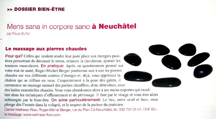 Wellness-Flow fait partie des 50 adresses de bien-être et des 16 adresses de massage sélectionnées par L'Hebdo. (L'Hebdo du 30 mai 2013)
