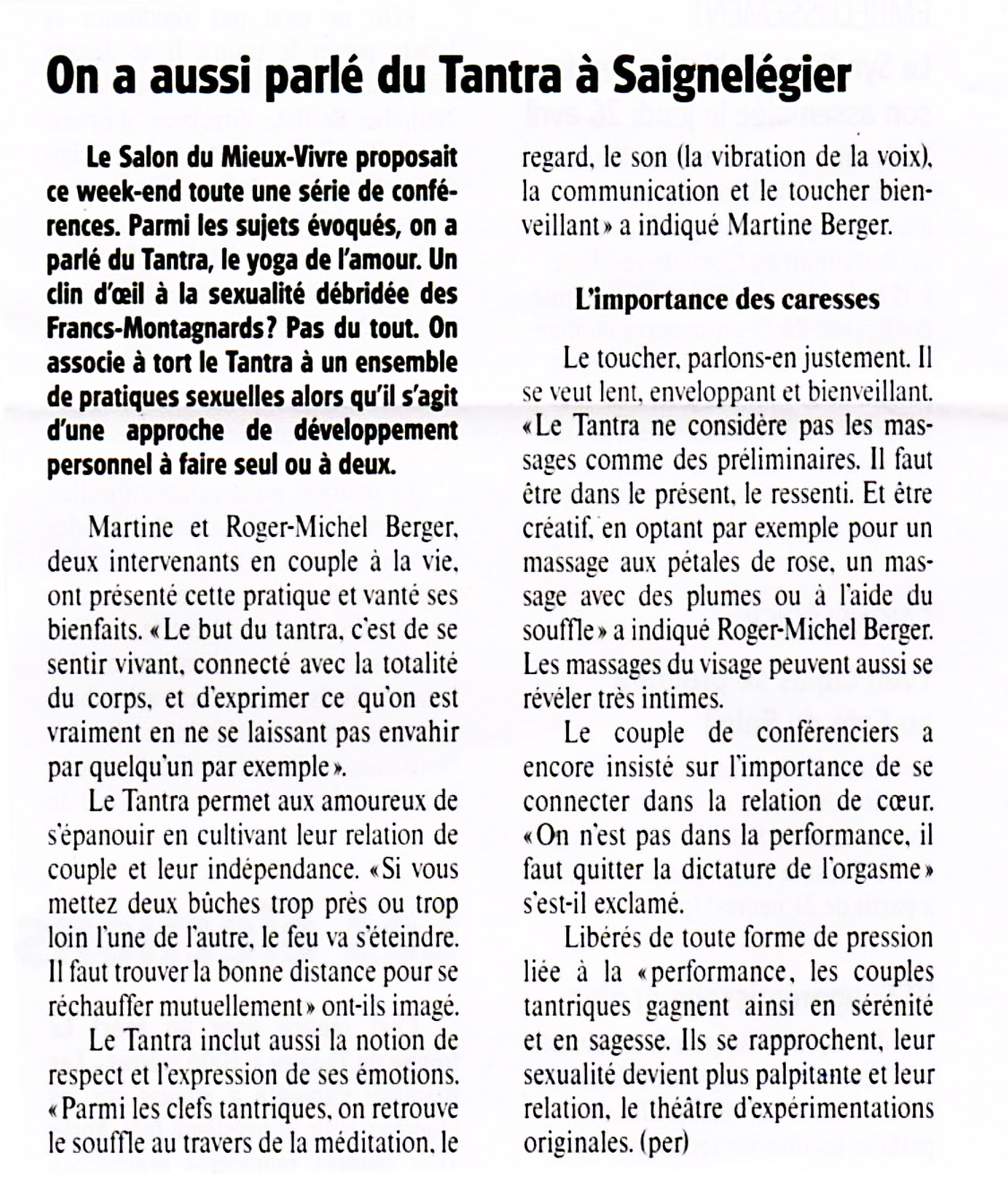 Ils sont 2 audacieux, un couple qui a changé de vie, nous les rencontrons à Neuchâtel. Ils sont devenus des spécialistes du tantra, donnent des conférences, pratiquent des stages, et connaissent un joli succès. Martine et Michel Berger nous ont ouvert les portes de leur espace un après-midi où ils ont convié une vingtaine de participants à un cours de méditation active.